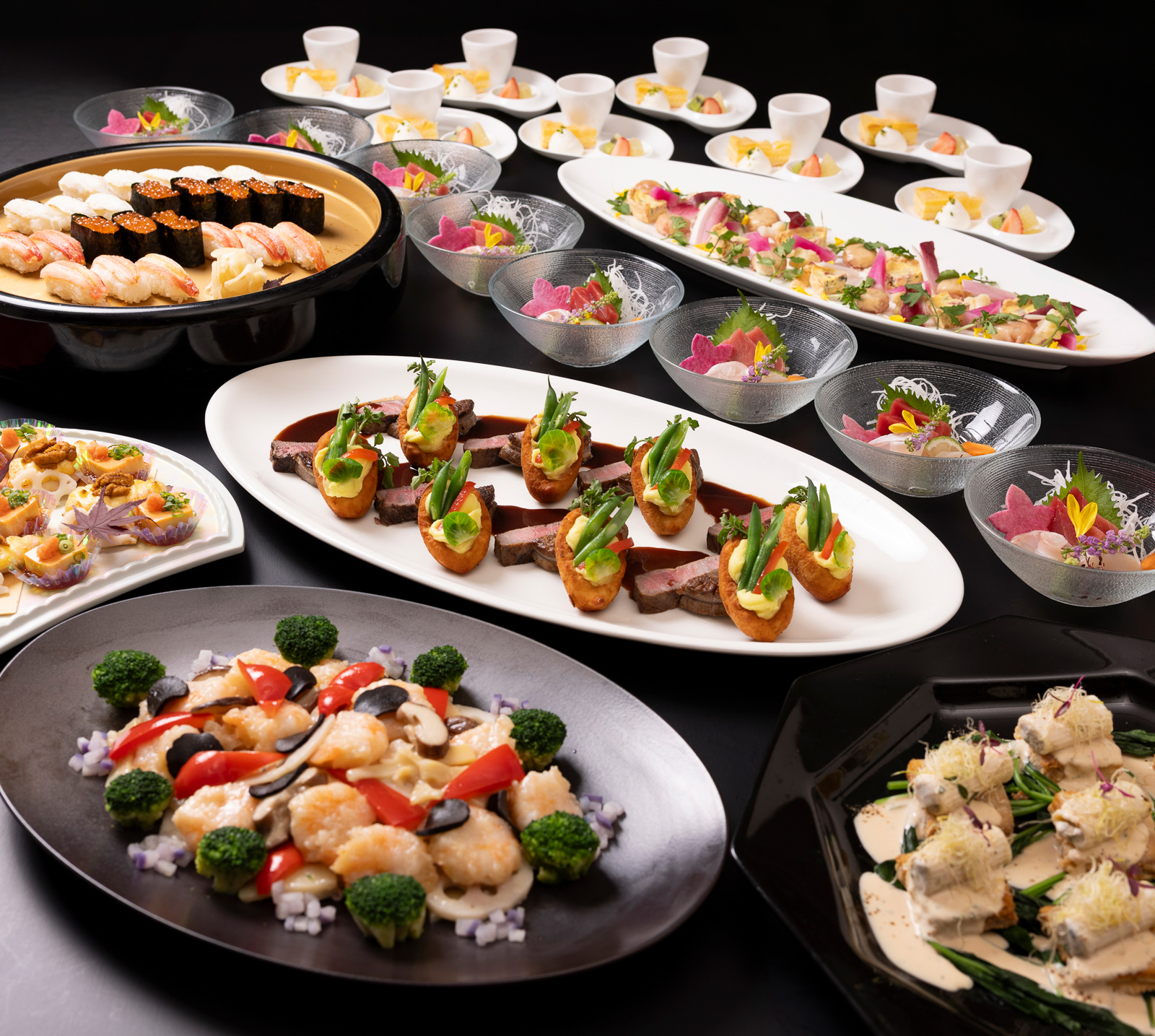 バラエティ豊かに用意された料理をお好きな分だけお取りいただき、気の合う方々と楽しい時間をお過ごしください。