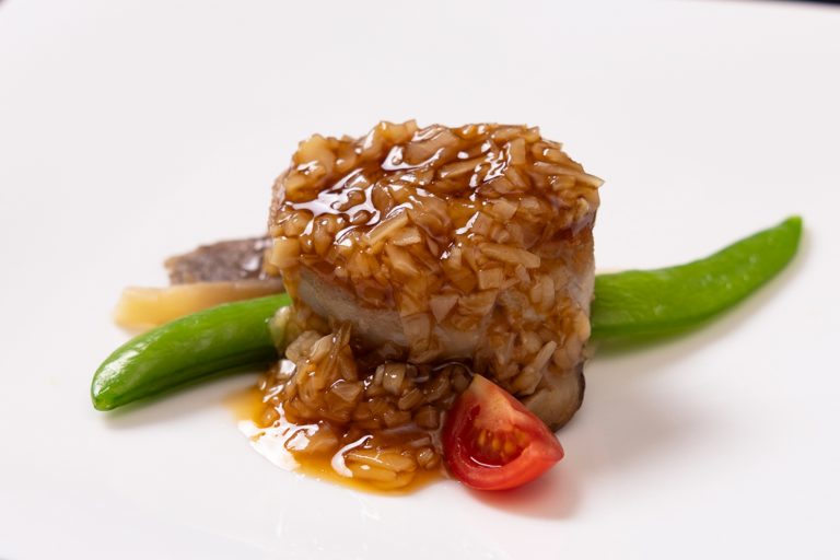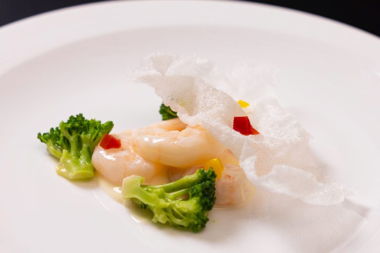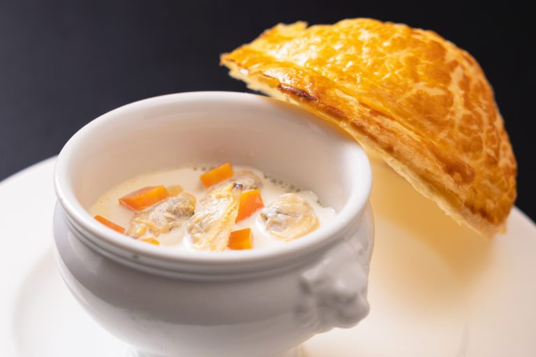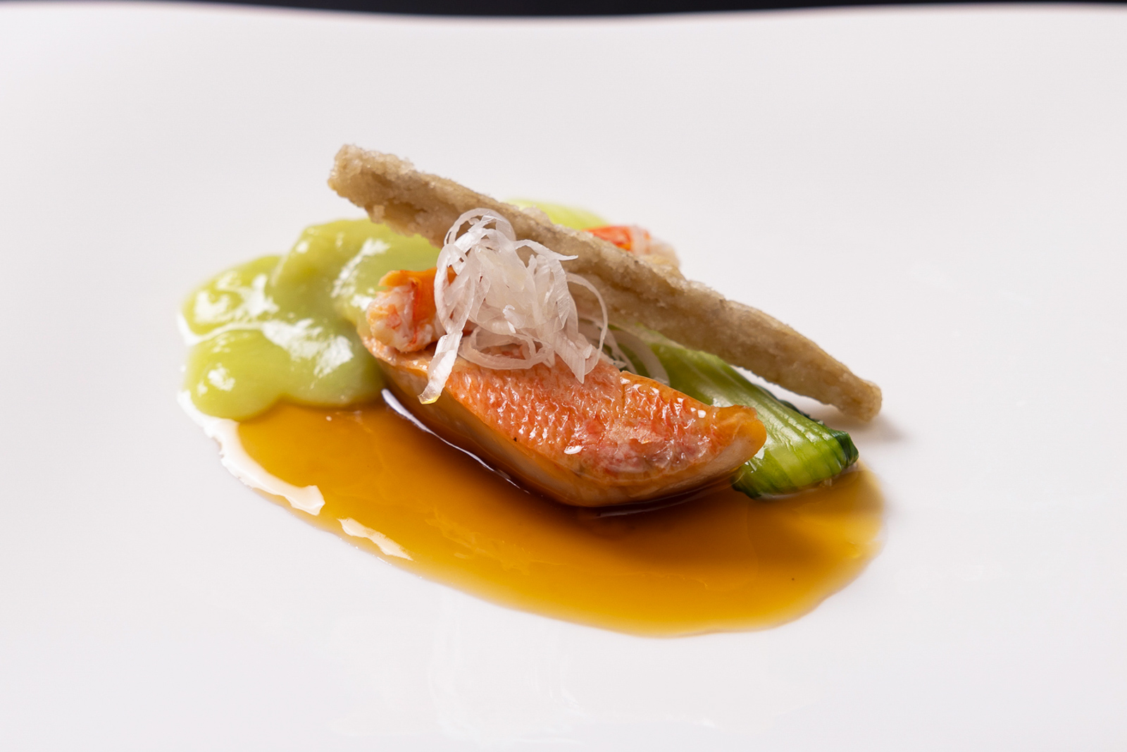 ❼ 金目鯛の蒸し汁と空豆の2色香りソース