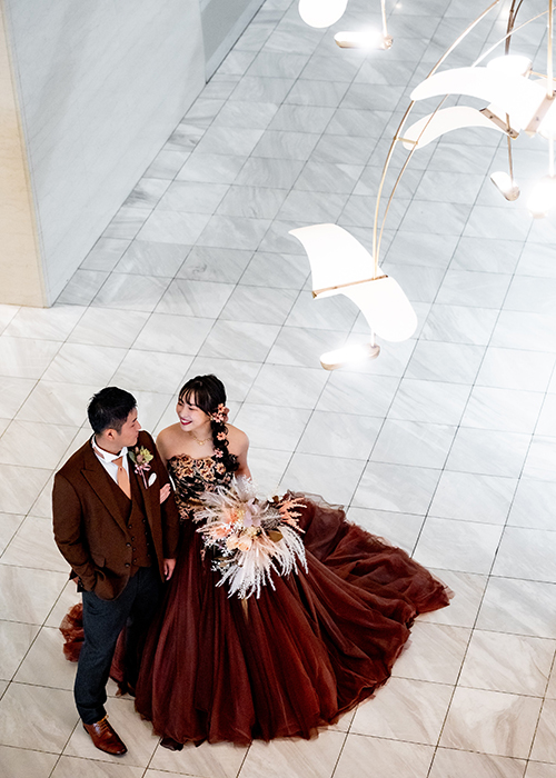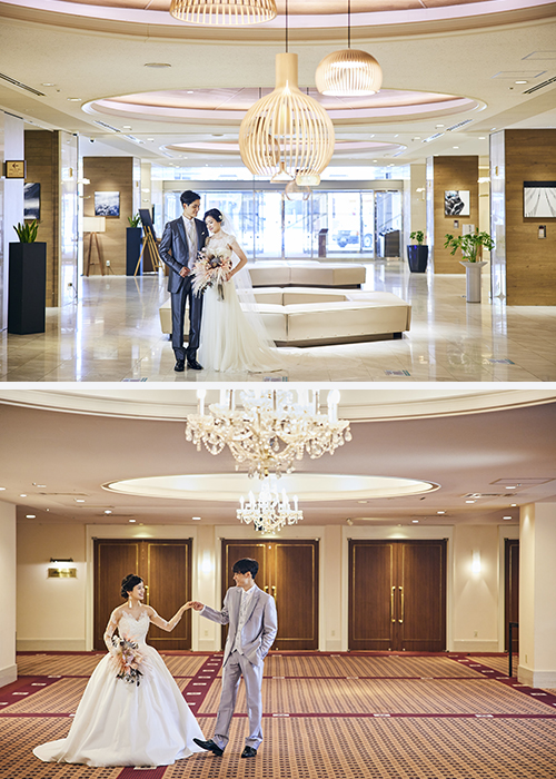 日本古来の伝統美が印象に残る荘厳な神殿での神前式と、披露宴当日には撮影できないホテル館内ロケーションでゆっくりおふたりらしい作品をお写真で残すフォトウェディングを。